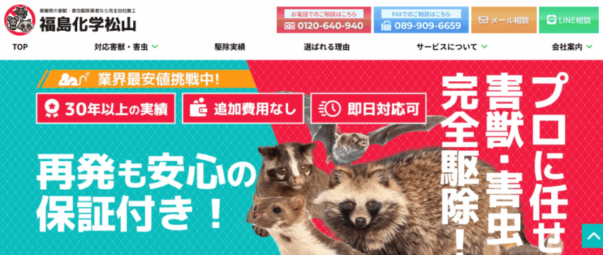 特徴・サービス | 福島化学松山では、ゴキブリやシロアリ、ハチ、ネズミといった害虫駆除はもちろん、害獣や鳥類の被害対策にも対応しています。自宅や人体に影響が出るようなケースでも、無許可での駆除は法律で制限されています。感染症やケガのリスクもあるため、個人での対応は避け、専門業者にお任せください。当社では、白蟻駆除に5年、害獣駆除に1年、鳩対策に最大3年の保証を設定し、長期的な安心をお届けしています。紹介業者を介さない自社施工のため、中間マージンや追加料金も不要。明瞭な料金体系で信頼されるサービスを提供しています。 |