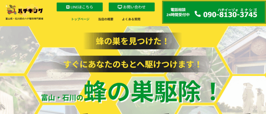 お客様の住まいが安心できる場所であるようにとの思いから、私たちは創業以来、多くのご相談に寄り添い、真心を込めたサービスを提供してまいりました。年々増加するハチ被害への対応はもちろん、被害者を食い物にする悪質な業者によるトラブルにも真摯にサポート。私たちは「確かな技術」「丁寧な作業」「明確な料金設定」を柱に、信頼される駆除業者であることを目指しています。これからも多くの方に「ハチキングでよかった」と思っていただけるよう努めてまいります。