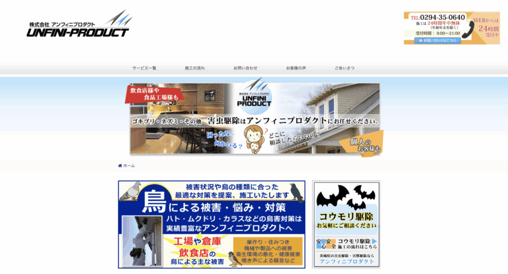 所在地 茨城県日立市末広町3-19-9 電話番号 0294-35-0640 業務内容 ゴキブリ ネズミ ハクビシン コウモリ アライグマ 蚊 ハエ カメムシ トコジラミ シロアリ ハト ムクドリ カラス ダニ ノミ アリ 蜂 代表氏名 金井 雅明