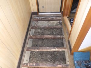空き家なので大きな補修はいらないとのことでしたが、トイレに向かう床はかなり危ない状態だったため、補修を行いました。